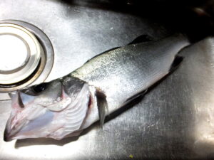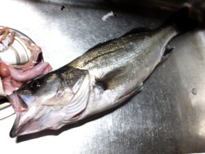 シンクに転がるヒラスズキ。