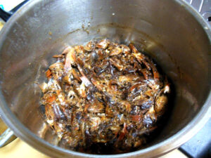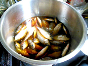 圧力鍋に処理したクロホシイシモチを投入し、醤油、みりん、砂糖を投入。