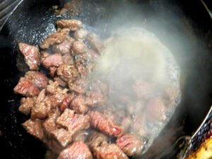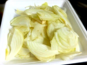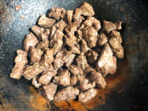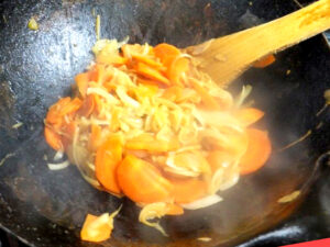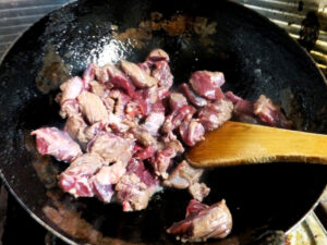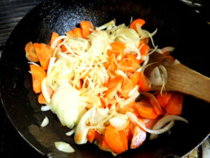 一旦、シカ肉を取り出し、タマネギとニンジンを炒めます。