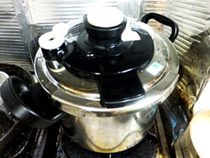 シカ肉、さっきの汁、炒めたタマネギ&ニンジンを圧力鍋に投入。